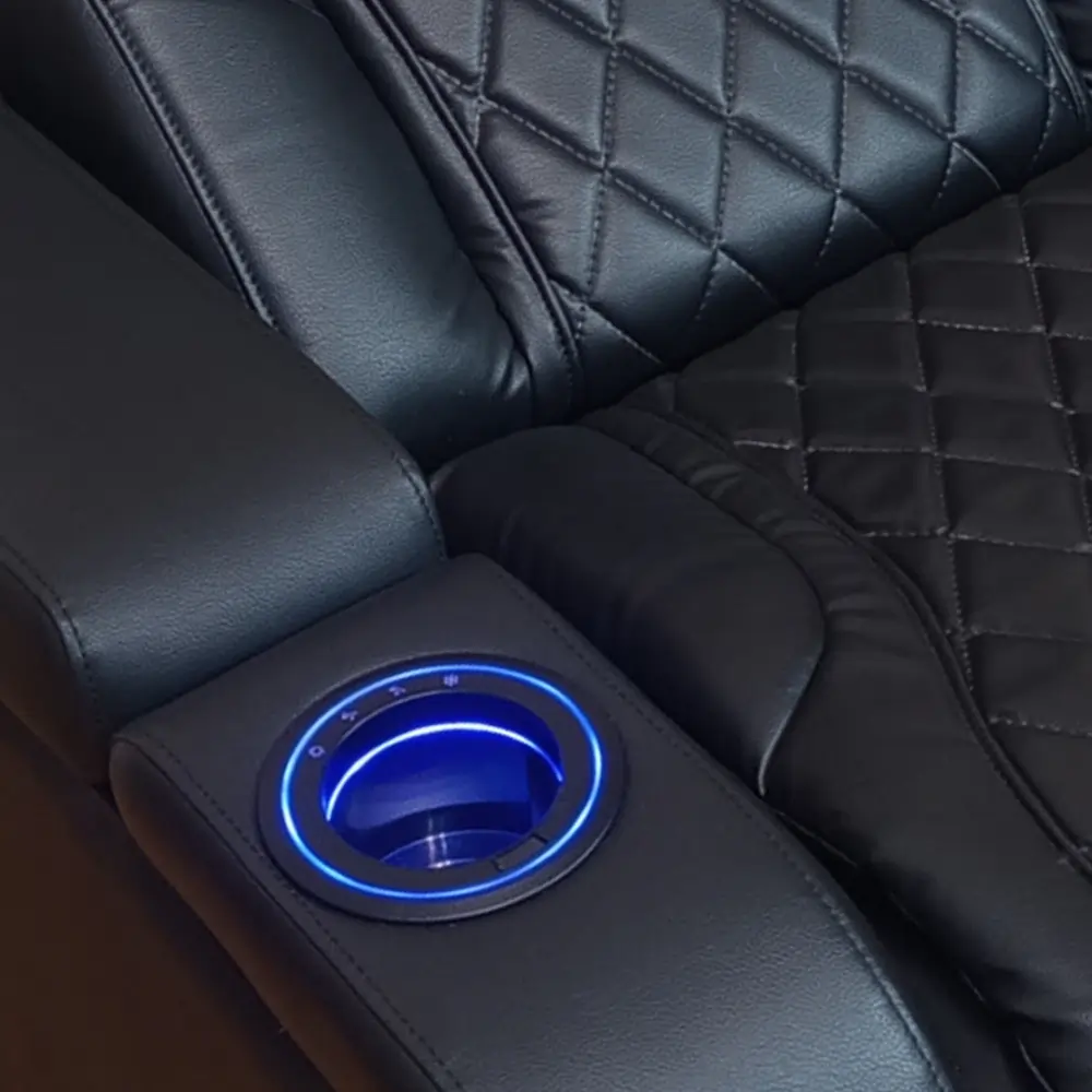 یکی از امکانات بسیار خاص و متفاوت این مدل، وجود جالیوانی LED دار مجهز به سردکن است. روشنایی ملایم LED در محیط تاریک اتاق سینما، جلوهای جذاب ایجاد میکند و دسترسی به نوشیدنی را آسانتر میسازد. این ویژگی حس یک سالن سینمای VIP واقعی را در خانه تکمیل میکند.
